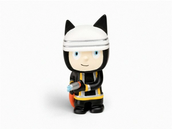Der Kreativ-Tonie Feuerwehrmann kommt in schwarzem Feuerwehranzug und hält den Schlauch fest in beiden Händen. Er ist bereit zum Löschen!